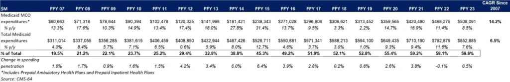 Table 1. Medicaid MCO Expenditures as a Percentage of Total Medicaid Expenditures, FFY 2007−2023 ($M)