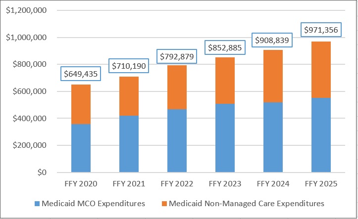 Figure 1. Total and MCO Medicaid Expenditures, FFY 2020–2025 ($M)