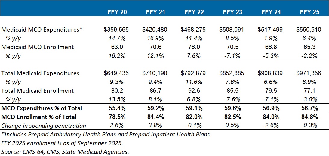 • Total Medicaid managed care spending (federal and state share combined) reached $550.5 billion in FFY 2025, up from $517.5 billion in FFY 2024.