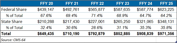 The HMAIS analysis looks at CMS-64 preliminary estimates of Medicaid spending by state for FFY 2025. CMS tracks state expenditures through the automated Medicaid Budget and Expenditure System/State Children’s Health Insurance Budget and Expenditure System (MBES/CBES).