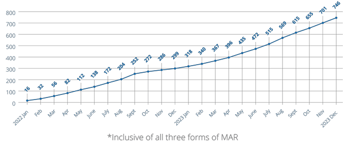 Figure 1. Running total of unique individuals who have received MAR in Jail in Illinois from inception of data collection from counties through December 2023. (MAR is medication assisted recovery – the term used for medication assisted treatment in Illinois.)