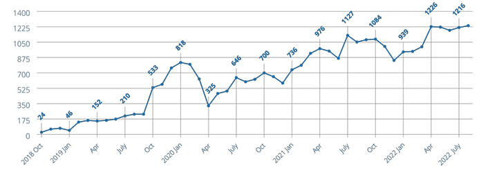 Figure 2. Running total of person-months individuals who have received MAT in jail in California participating jails from program inception through August 2022