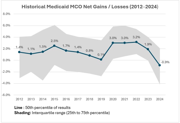 Figure 1. Historical Medicaid MCO Net Gains/Losses, 2012‒2024 (39 States, DC)