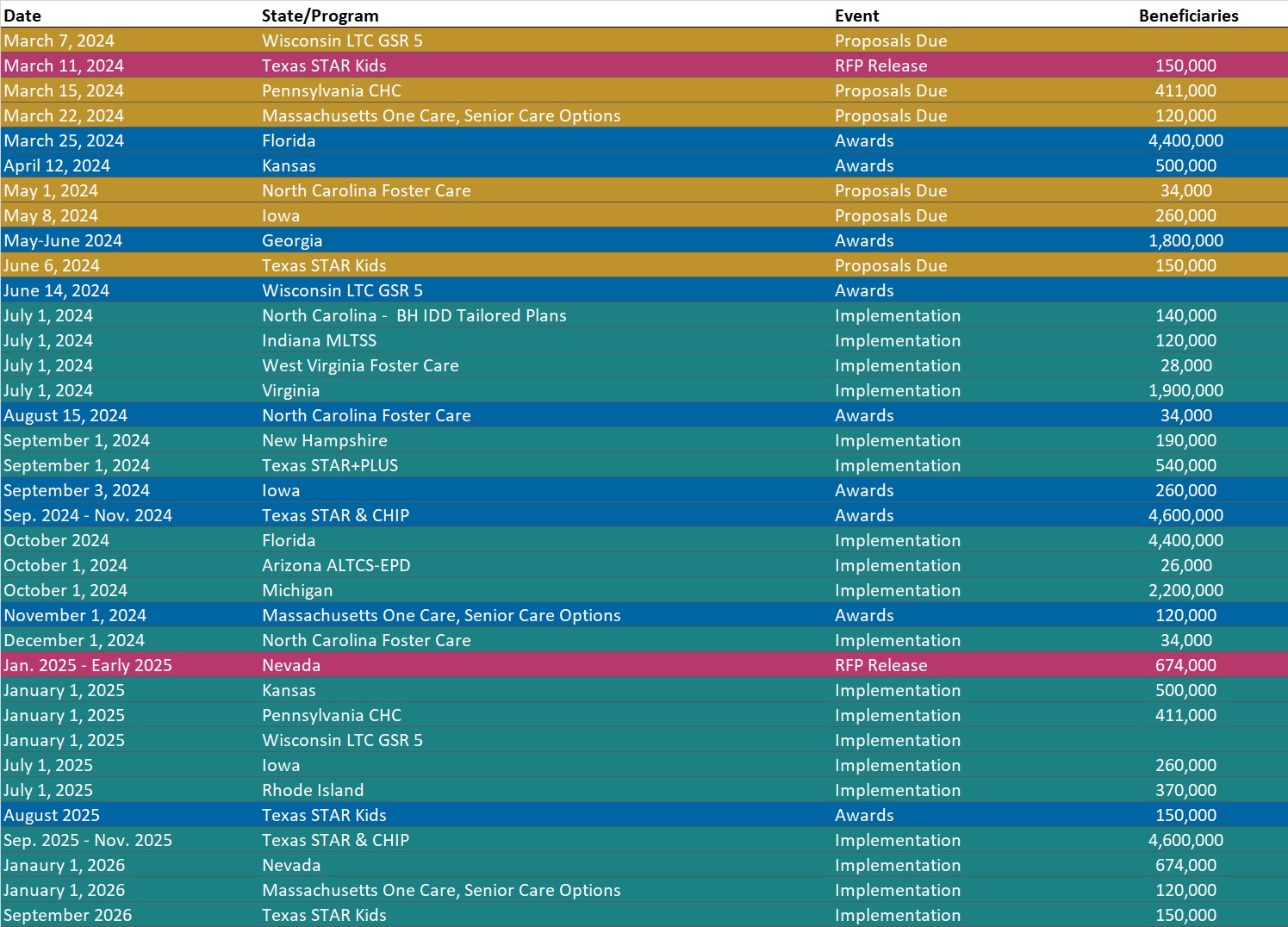 Iowa Releases Health Link Medicaid Managed Care RFP to Reprocure One Contract. The Iowa Department of Human Services (DHS) released on March 1, 2024, a request for proposals (RFP) to provide physical health, behavioral health, pharmacy services, and long-term services and supports (LTSS) for the state’s traditional Medicaid program, the Children’s Health Insurance Program (CHIP) known as Healthy and Well Kids in Iowa (Hawki), and the Iowa Health and Wellness Plan (IHAWP). The state plans to contract with at least one vendor on the new contract. Centene/Iowa Total Care is the incumbent on the current contract which is set to expire on June 30, 2025. Other incumbents are Anthem/Amerigroup and Molina Healthcare, with separate contracts that have options through 2028. The contract term will run for four years, beginning July 1, 2025, with one two-year renewal option. Letters of intent are due March 20, proposals are due May 8, and awards are expected September 3.